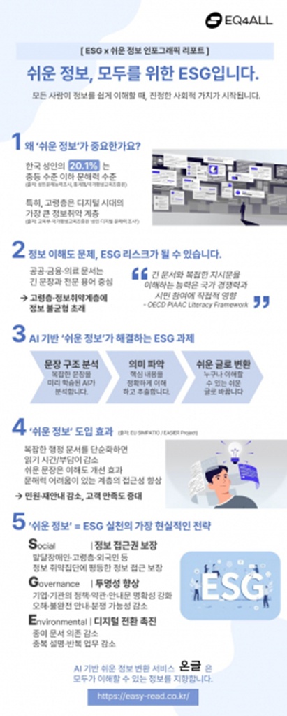 이번 인포그래픽은 △한국 성인의 문해력 수준 △고령층의 디지털 문서 이해 격차 △공공·금융·의료 문서의 난이도 문제 △AI 기반 쉬운 정보 변환 기술이 제공하는 효과 △ESG 관점에서의 적용 방향 등을 한눈에 볼 수 있도록 구성됐다.