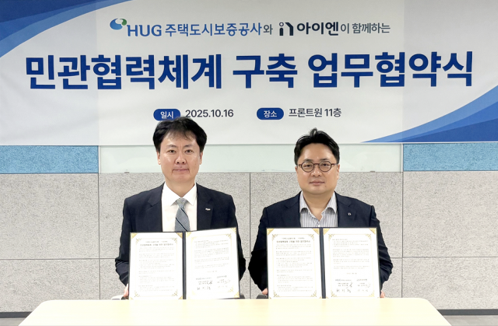 핵심 협력 분야인 ‘임차in케어’는 아이엔이 2025년 ‘경기도 생성형 AI·공공데이터 활용 창업경진대회’에서 우승(경기도지사상 수상)을 차지한 대표 서비스로, 이번 협약을 통해 주택도시보증공사와 함께 고도화에 나선다.