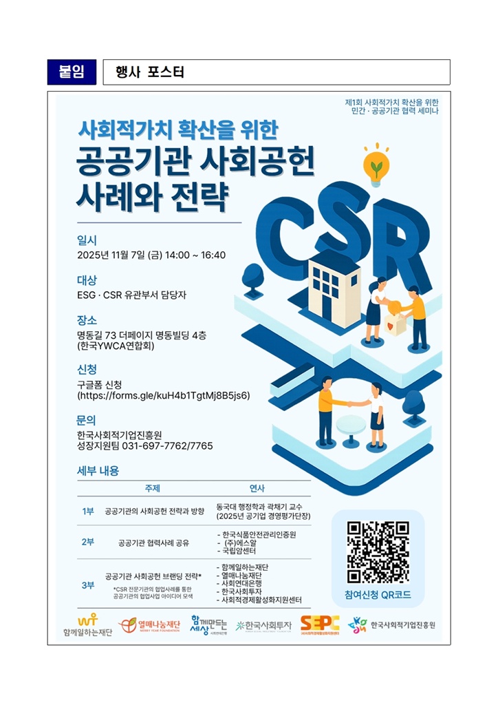 세미나는 총 3부 구성으로 진행되며, 공공기관 CSR·ESG 담당자를 대상으로 공공기관의 사회공헌 전략과 현장사례, 그리고 향후 협력 방향을 중심으로 다양한 논의가 이어질 예정이다.