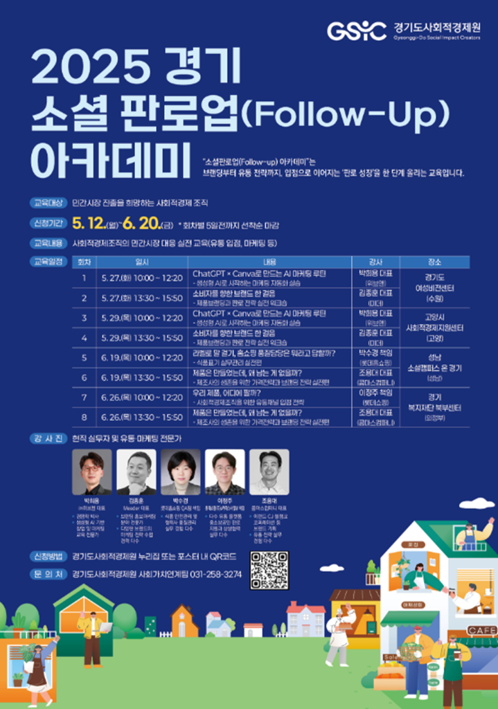 경기도와 경기도사회적경제원이 사회적경제조직의 민간시장 진입 역량 강화를 위한 실무형 교육 프로그램 ‘2025년 경기소셜 판로업(Follow Up) 아카데미’의 참가자를 선착순 모집한다. 교육은 5월 27일부터 6월 26일까지 총 4회에 걸쳐 경기도 북부·남부권에서 진행된다.