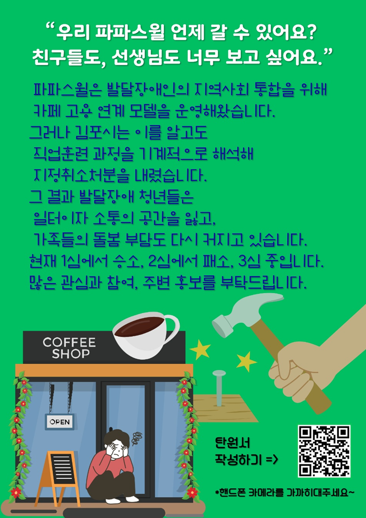 발달장애 청년들의 소중한 일터이자 사랑방이었던 ‘파파스윌’이 문을 닫을 위기에 처했다. 김포시의 행정처분으로 인해 갈 곳을 잃은 발달장애인들과 그 가족들이 눈물로 도움을 호소하고 있다.